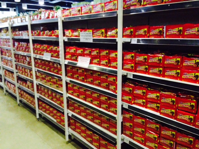 It was a futile and frustrating shopping experience that almost turned hostile when I walked down the center isle and saw six shelving units completely stocked, from top to bottom, with beng-beng chocolate bars. It was such an incredibly absurd spectacle that I couldn’t help but stop in my tracks. I set my empty grocery basket down beside me, rifled through my backpack until I found my cell phone, and then figured out, right then and there, just how many chocolate bars I was looking at. Six shelving units, seven shelves on each unit, twenty-eight boxes/shelf, and twenty-five bars/box = 29,400 beng-bengs.