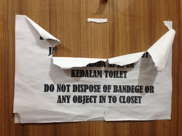 This sign was posted in a bathroom in Bali. The person who wrote it used the proper use of “toilet” in the Indonesian section, but, mistranslated it to “closet” in the English section.